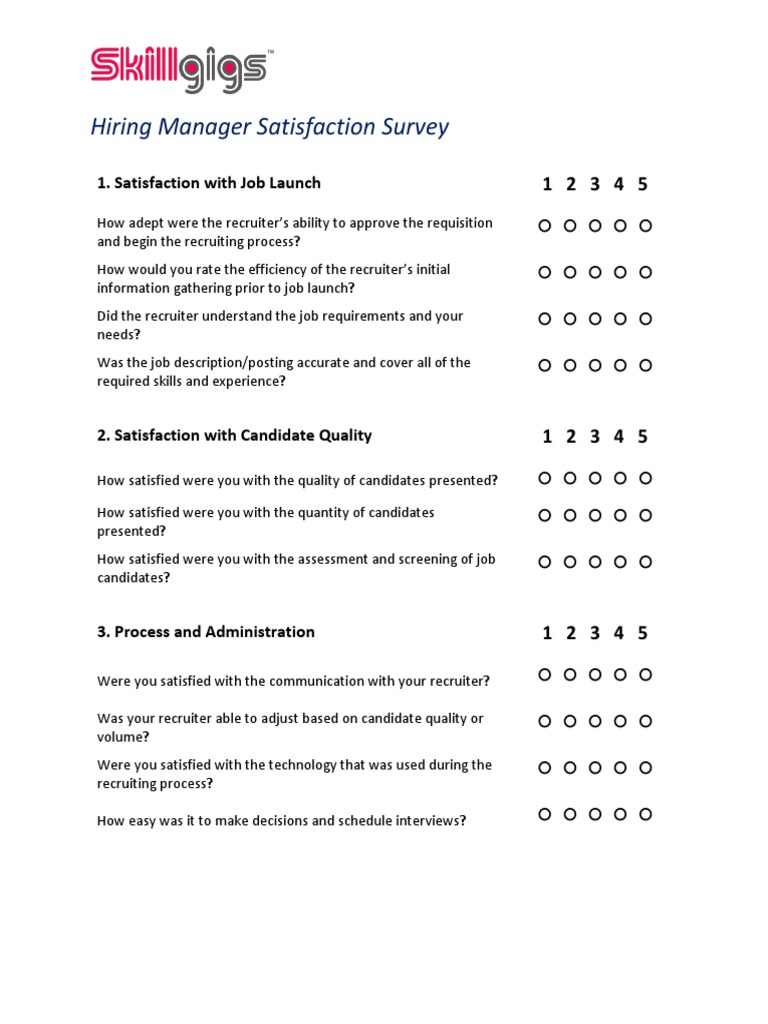Low Fair High Did the hiring manager make good use your time together. Using Hiring Manager Survey Questions to establish a baseline of Hiring Manager satisfaction is a great way to set a benchmark for future recruitment performance and helps define challenges in the hiring function. Hiring Manager Checklist Satisfaction Survey The resources you need to build and maintain the best relationships with your hiring managers.